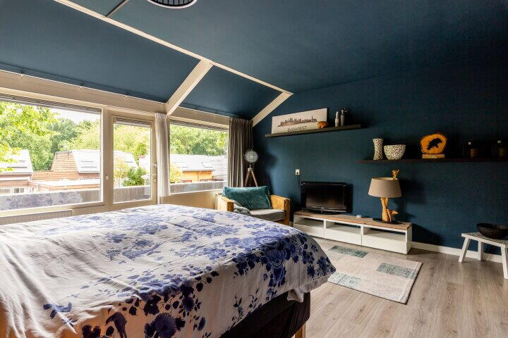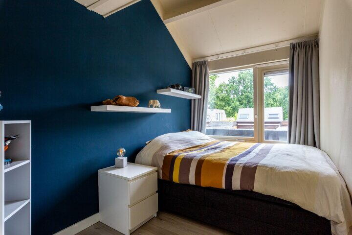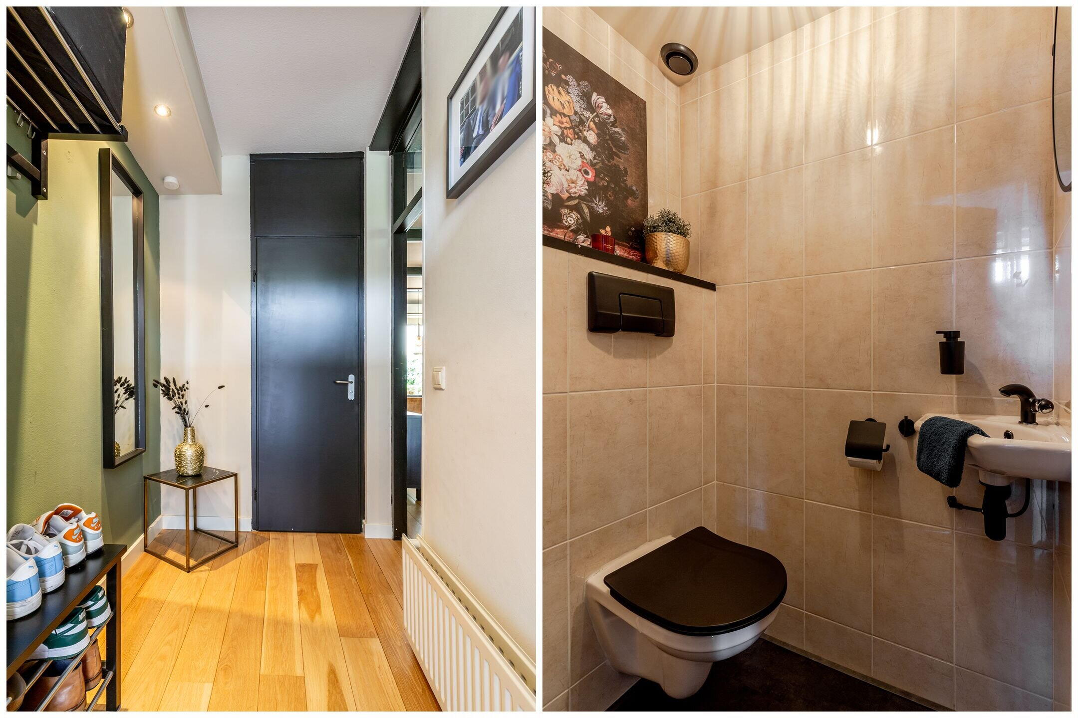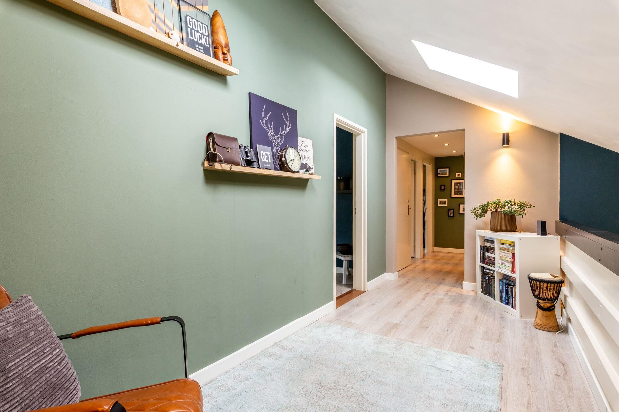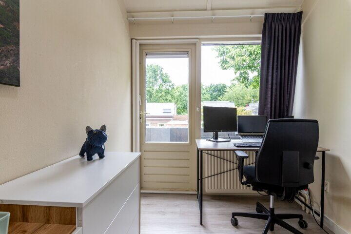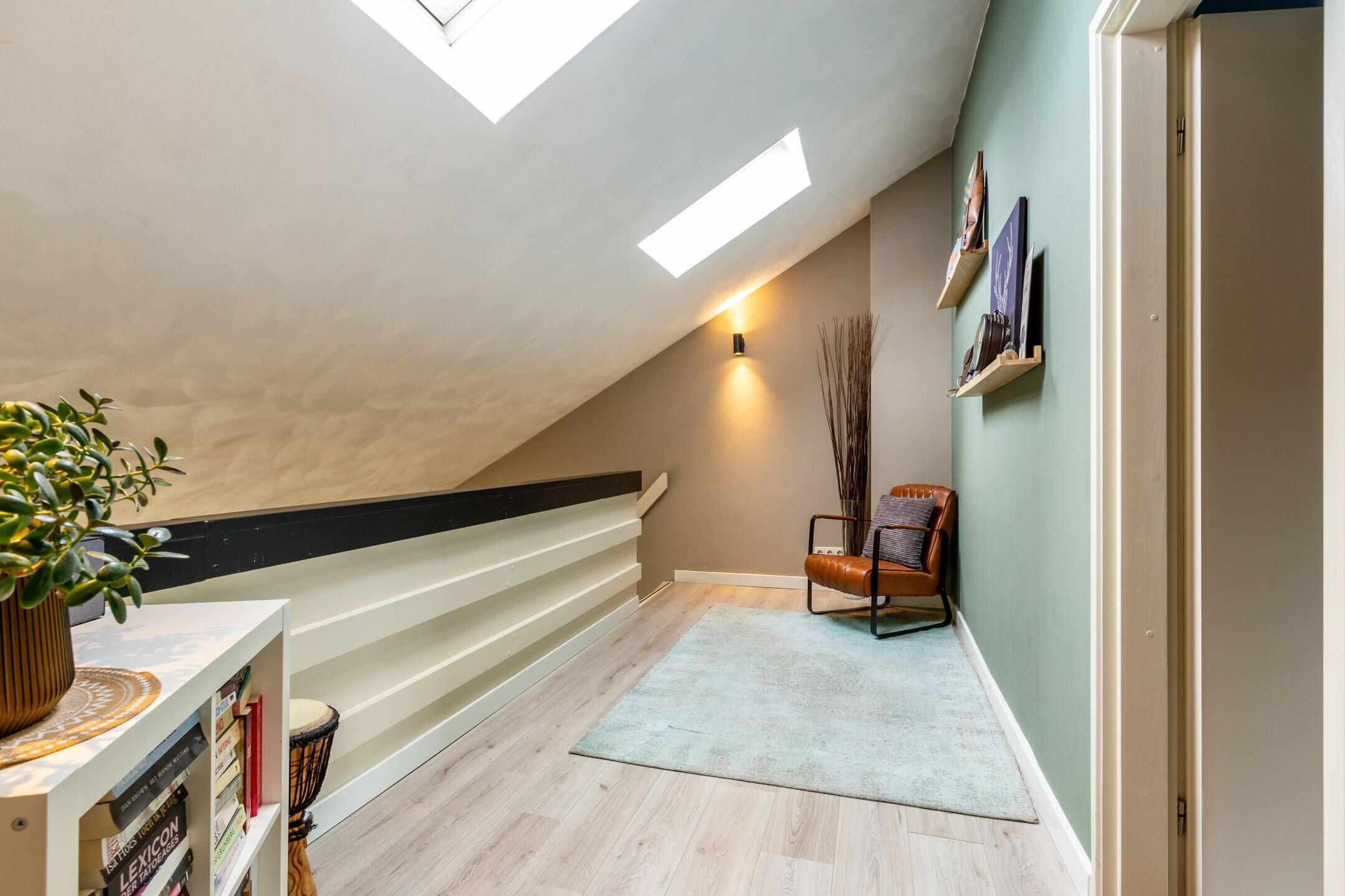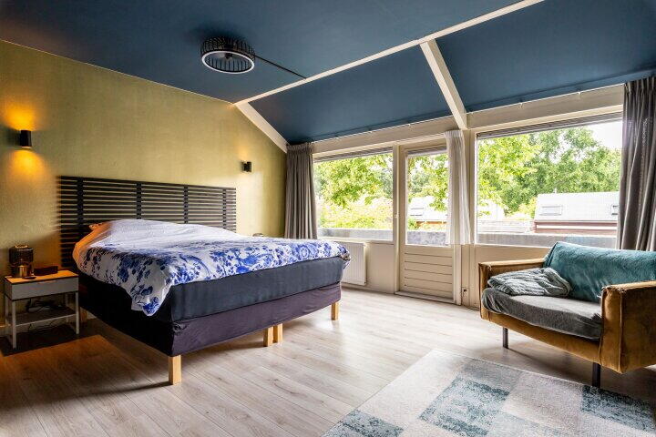 Eerste verdieping: Ruime, zogenaamde vide/ overloop met veel lichtinval door de twee dakramen; separaat toilet en een berg-/ CV-kast met opstelling voor de CV (Intergas geplaatst in 2019); drie (oorspronkelijk 4) slaapkamers van respectievelijk ca. 9,1 / 9,3 en 22,2m², allen met toegang tot het balkon en vanuit de kleinste is er toegang tot de vliering; volledig betegelde badkamer (2022) met een dakraam, separate inloop douchehoek met stortdouche, (hoek)ligbad, verlaagd plafond met inbouwspots en een wastafelmeubel met dubbele wastafel.