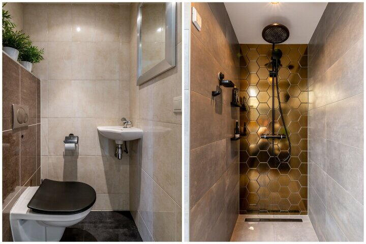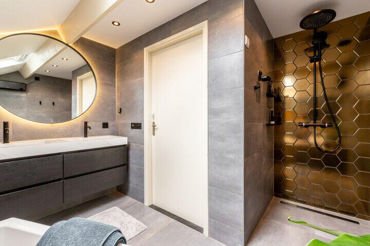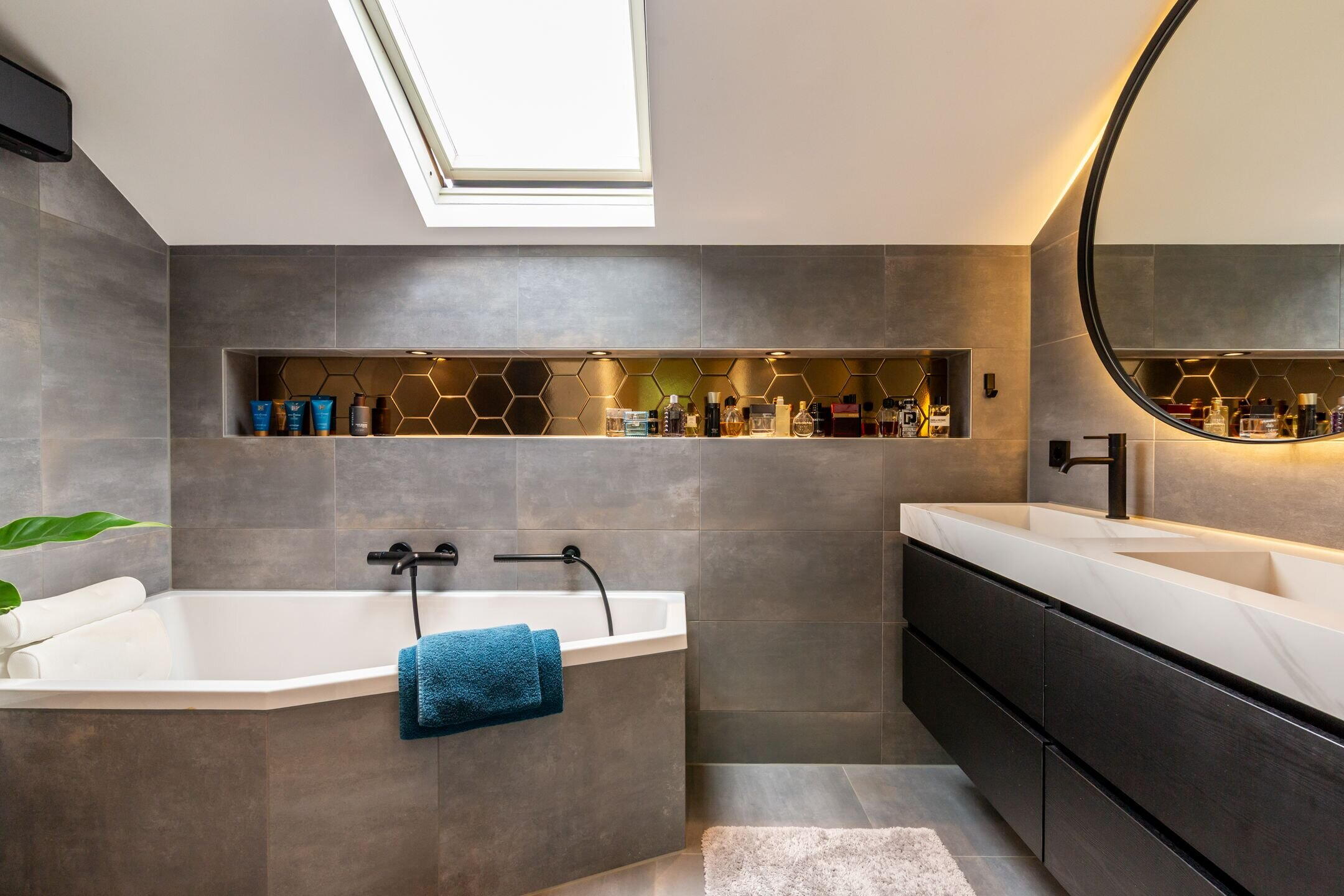- Douche, dubbele wastafel, ligbad, en wastafelmeubel