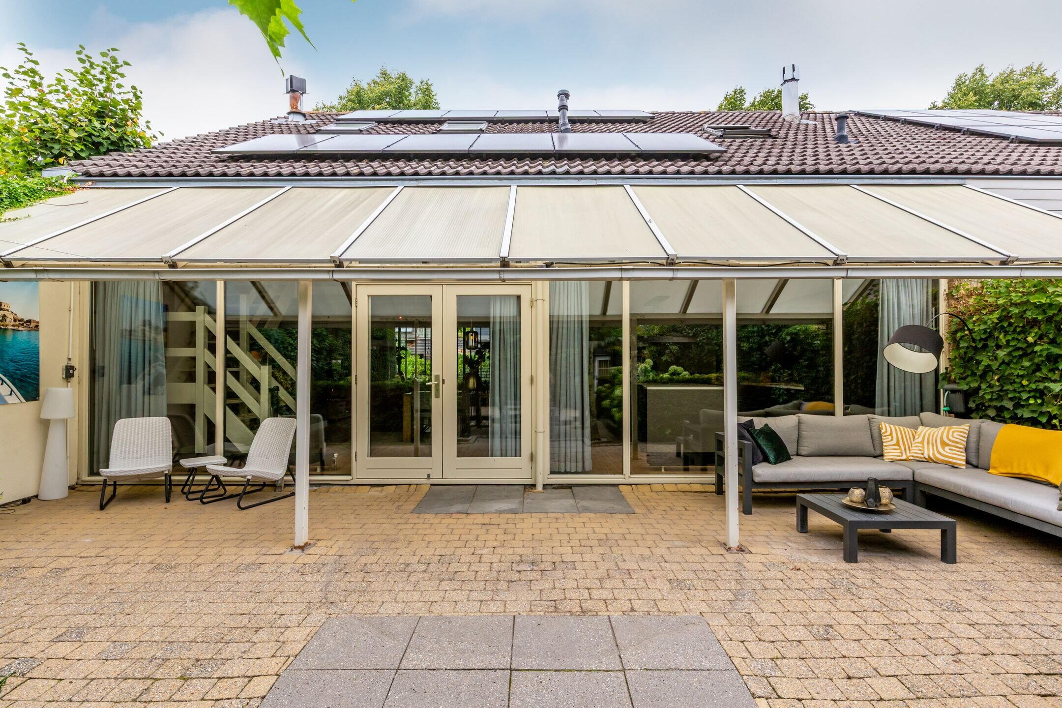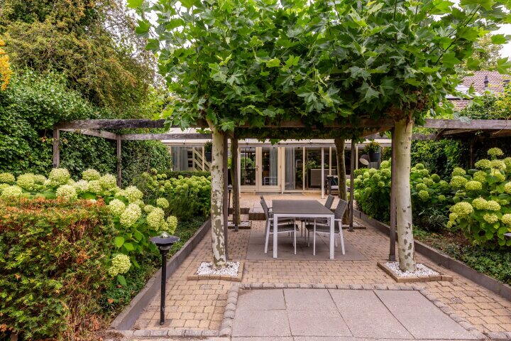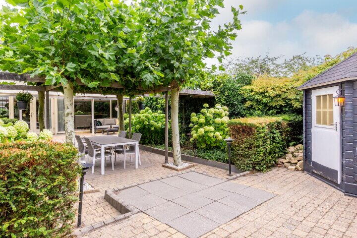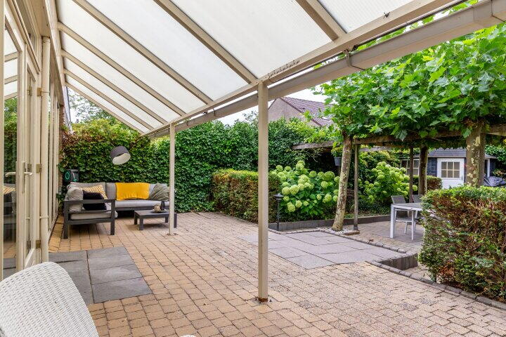 Tuin: Op het zuiden gesitueerde achtertuin van ca. 9,8 x 14,50 meter met een woningbrede overkapping, een tweetal terrassen, erfafscheiding en diverse fraaie beplanting.